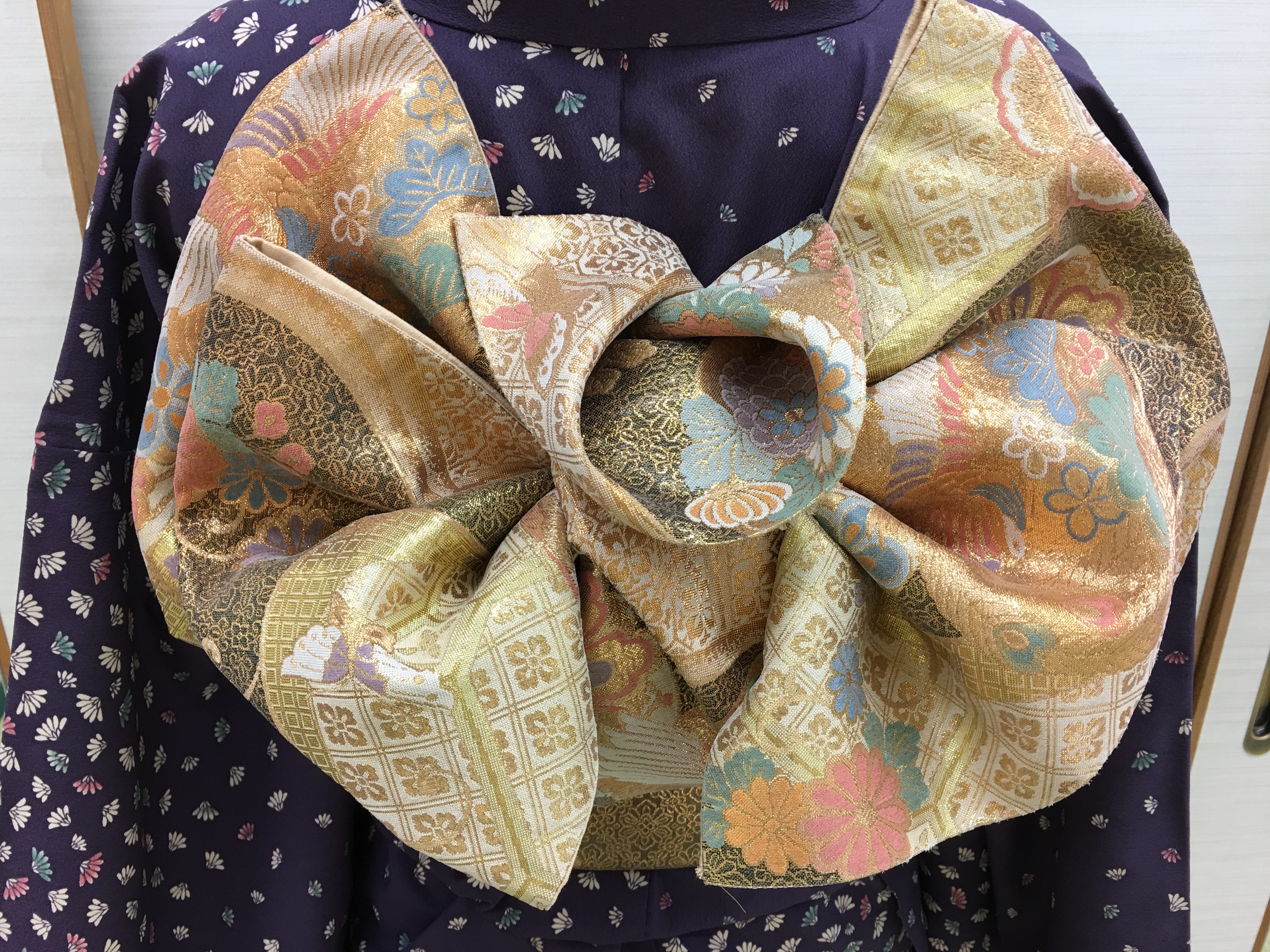 帯の長さの六割に柄があります。帯は身体に二巻きします。一巻きめは中に入って見えないので、柄がなくても大丈夫なんです。
