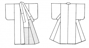 男子の衣袴(きぬばかま)、女子の衣裳(きぬも)に見られる衿の袷は左衽(さじん)でした。現在とは反対の打ち合わせです。