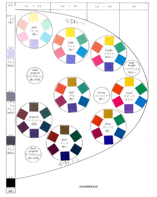 完全に同じトーンは、専門家ではないのでむずかしいとは思いますが、上の表の中で同じ丸の中にある色は、同じトーンの色です。